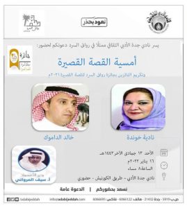 يكرم نادي جدة الأدبي يوم غد الأحد 13 جمادى الآخر، الفائزين بجائزة رواق السرد للقصة القصيرة 2021م، وذلك في أمسية قصصية يحييها القاصان خالد الداموك، ونادية خوندنة..ويدير الأمسية الأستاذ سيف المرواني.