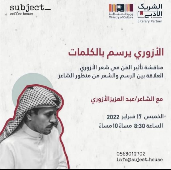 ينظم المقهى الثقافي “سبجيكت كوفي هاوس” الشريك الأدبي لوزارة الثقافة، أمسية بعنوان: العلاقة بين الرسم والشعر في منظور الشاعر عبدالعزيز الأزوري ومن تقديم الفنانة نجاة مفتاح، وذلك يوم الخميس الموافق 17فبراير 2022، في الساعة 8:30 مساءً.
