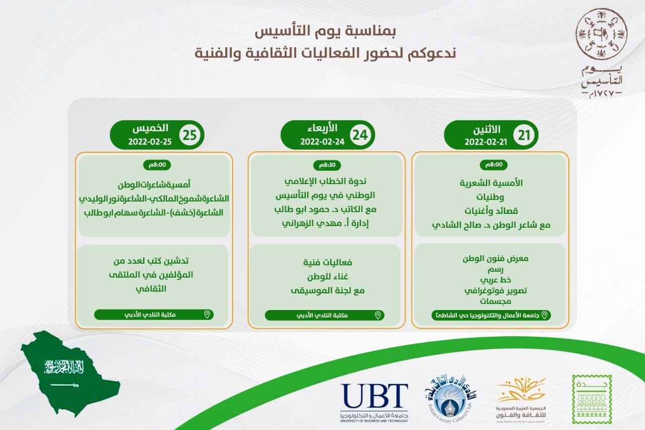 تنطلق مساء اليوم الإثنين فعاليات يوم التأسيس المشتركة بين النادي الأدبي الثقافي بجدة وجمعية الثقافة والفنون وجامعة الأعمال والتكنولوجيا، حيث تقام الأمسية الشعرية “وطنيات قصائد وأغنيات” مع شاعر الوطن الدكتور صالح الشادي، وذلك في الساعة الثامنة مساءً بمقر جامعة الأعمال والتكنولوجيا بحي الشاطيء، حيث يقام على هامش الفعالية “معرض فنون الوطن” من رسم وخط عربي وتصوير فوتوغرافي.