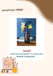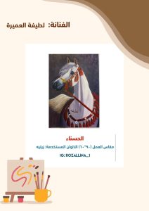فنانة تشكيلة محترفة: أجد في فرشاتي سعادتي وترجمة لما بداخلي من مشاعر وأحاسيس، وأنتمي للمدرسة الواقعية، وفي الآونة الأخيرة بدأت بالتأثيرية، حصلت على الكثير من الدورات بجميع أنواع الفنون، شاركت بالعديد من المعارض بالمملكة العربية السعودية والكويت ومصر، حصلت على المركز الأول لمحاكاة (لوحة عيال الحارة) للفنان التشكيلي السعودي صالح النقيدان، مدربة معتمدة بالفنون التشكيلية والحرفية، مدربة معتمدة بالتدريب التقني والمهني (ToT)، حاصلة على دبلوم الفن التشكيلي، أخصائية في التحليل النفسي للتوقيع وتفسير رسومات وخربشات للكبار والصغار، عضو بنقابة الفنانيين الكويتيين، عضو بمجموعة مشروع رسام السعودية.