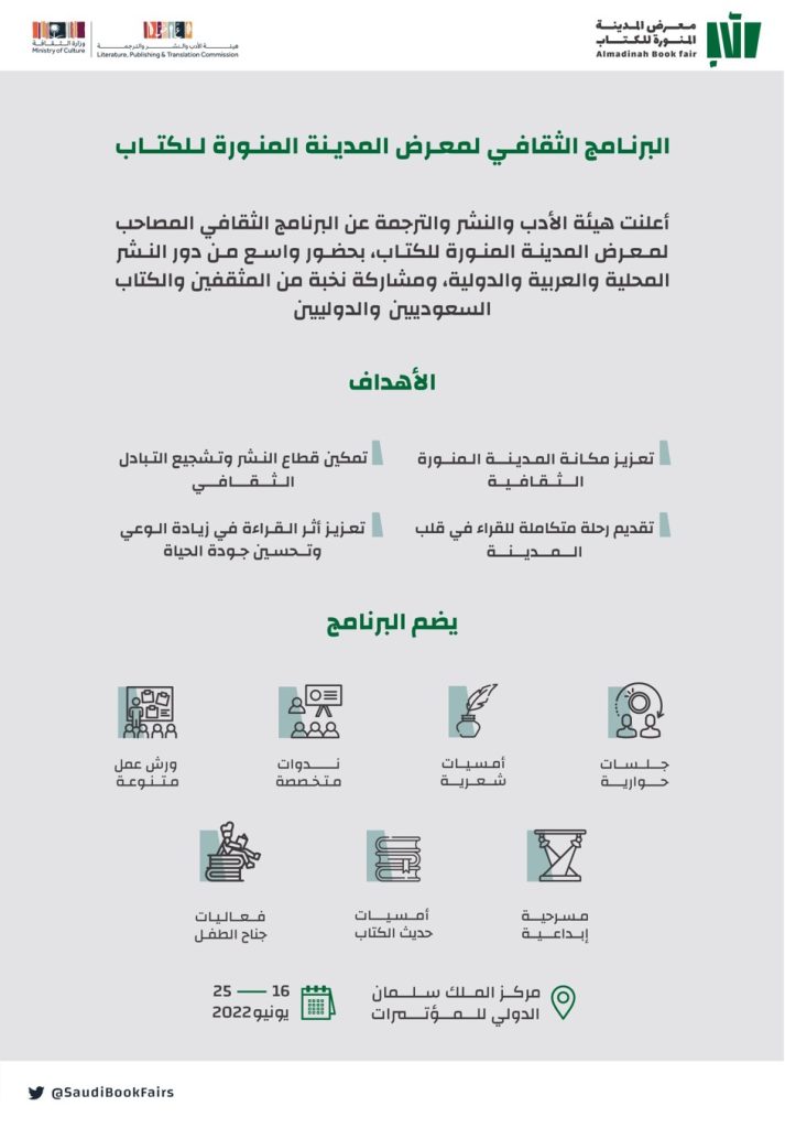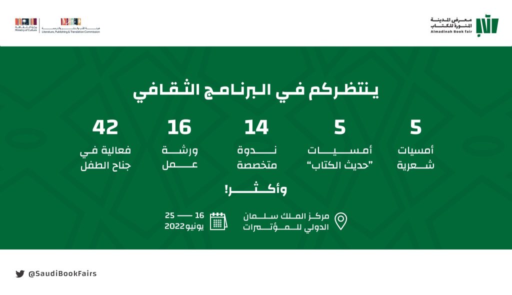 ينطلق معرض المدينة المنورة للكتاب لهذا لعام 2022 يوم الخميس الموافق 16 إلى 25 من الشهر نفسه ولمدة 10 أيام حافلة بالتجارب الثقافية والبرامج الإثرائية المتنوعة.