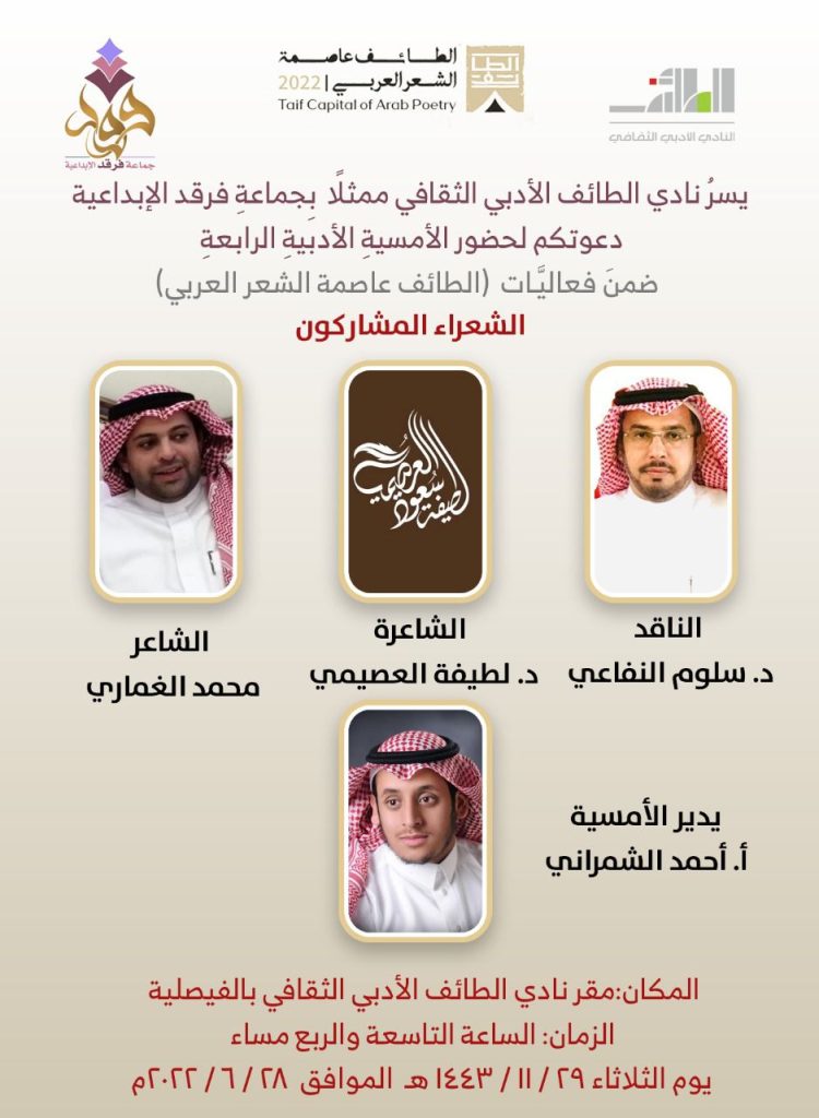 ينظم نادي الطائف الأدبي الثقافي ممثلًا في جماعة فرقد الإبداعية الأمسية الأدبية الرابعة والتي يشارك فيها كل من: