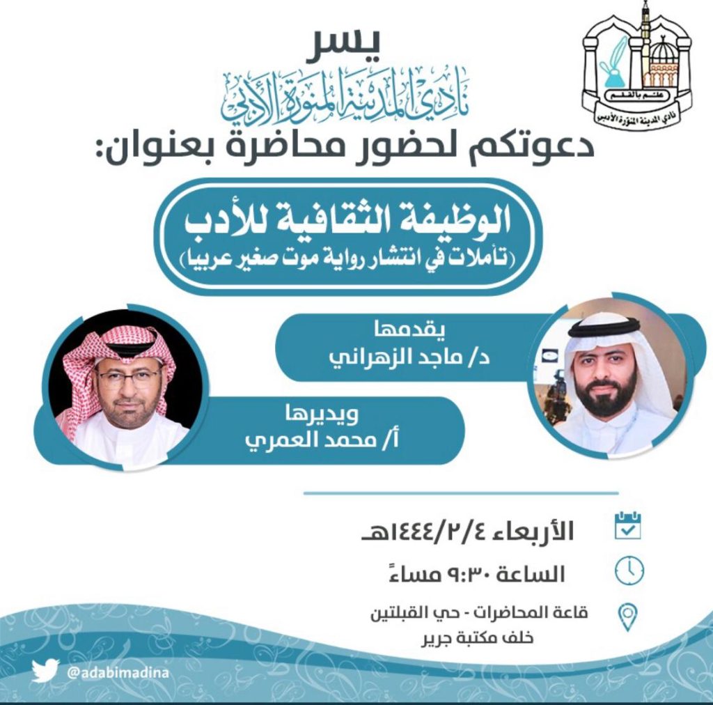 يقيم النادي الأدبي بالمدينة المنورة محاضرة بعنوان الوظيفة الثقافية للأدب..(تأملات في انتشار رواية موت صغير عربيًا) يقدمها الدكتور ماجد الزهراني وبإدارة الأستاذ محمد العمري، وذلك يوم غدٍ الأربعاء 1444/2/4هـ، في الساعة التاسعة والنصف مساءً بمقر النادي، ودعا النادي إلى حضورها وإثرائها بالمداخلات.