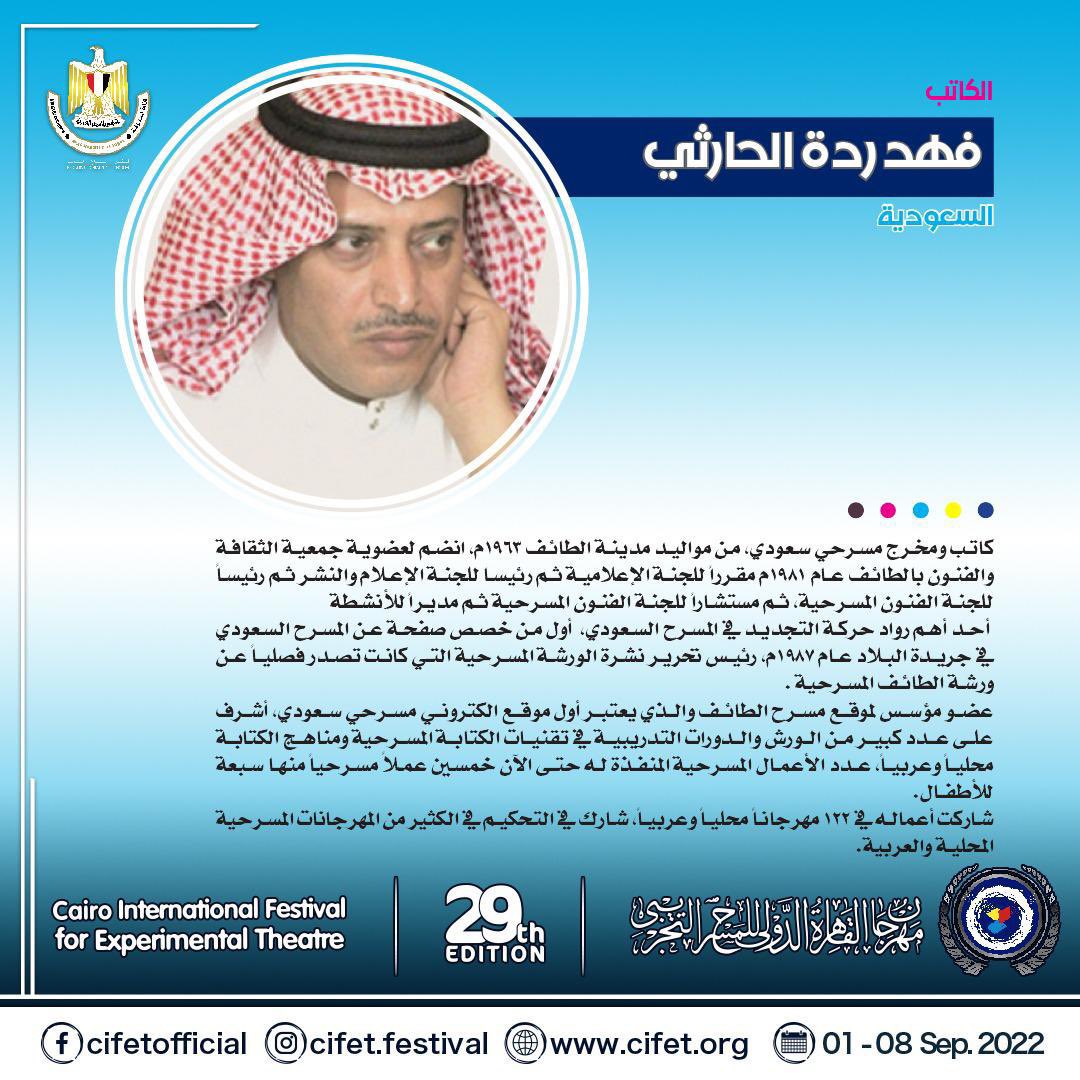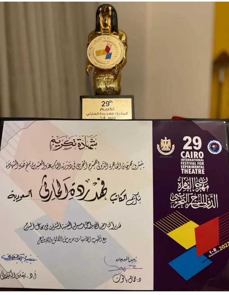 يطيب لجماعة فرقد الإبداعية بالنادي الأدبي الثقافي بالطائف، وأسرة مجلة فرقد الإبداعية أن تزف أعطر التهاني والتبريكات إلى المسرح السعودي المكرم في شخص عراب المسرح السعودي الأستاذ فهد ردة الحارثي في مهرجان القاهرة الدولي للمسرح التجريبي في دورته التاسعة والعشرين “تقديرًا لتاريخه الإبداعي ومسيرته الفنية المشرفة في مجال المسرح”.