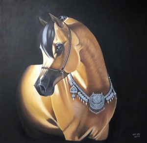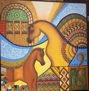 ٥- لوحات الخيل العربي للفنانة زهرة خلف والتي ترصد جمال الخيل العربي ممزوجة بالنقوش والزخارف العربية.