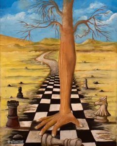 وضع الفنان لعبة الشطرنج في اللوحة في بداية الطريق الممتدة إلى نهاية الأفق لما لها من رمزية مركبة متعددة الخيوط والدلالات التعبيرية.