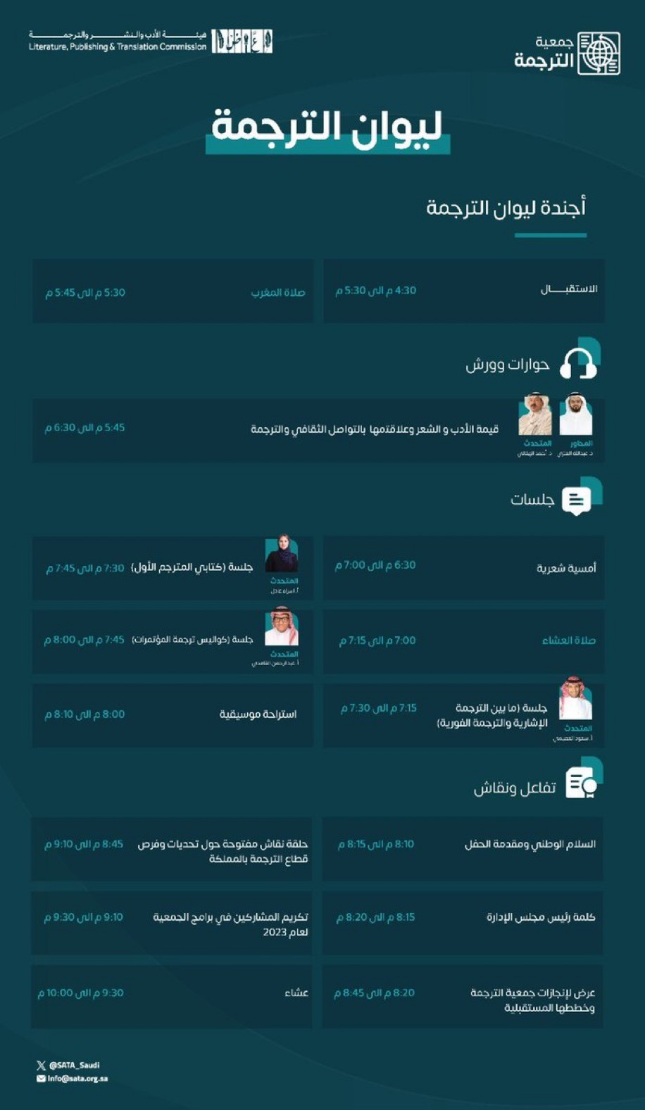 حيث تحتوي على جلسات حوارية وورش عمل تطويرية؛ لإثراء تجربة المترجمين والتعرف على قصصهم الملهمة، والبحث في مستقبل قطاع الترجمة.