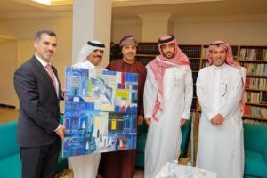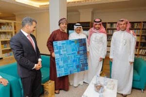 حيث اطلعوا على مرافق النادي، وقدَّم الباز شُكره وتَقديره للنادي الأدبي على دوره الريادي في خدمة الثقافة والفنون، بالإضافة للتعاون بين النادي والجمعية، وأثنى على ما يقوم به رئيس النادي الدكتور عبدالله عويقل السلمي من مجهودات في السير بالنادي ليكون في مقدمة الأندية الأدبية، وفي نهاية الجولة تم تقديم مجموعة من الإهداءات للضيوف عبارة عن مجموعة من مطبوعات النادي، وكذلك تقديم لوحات فنية من إنتاج أعضاء مُنتدى الفنون البصرية بالنادي للأستاذ خالد الباز ولقنصل سلطنة عمان وقنصل العراق.
