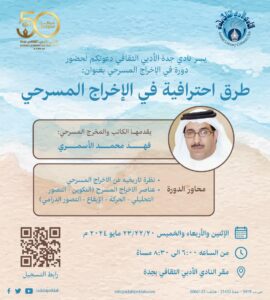 تأتي الدورة ضمن اهتمامات أدبي جدة بالشأن المسرحي، وسيقدم فيها معلومات كاملة عن الإخراج المسرحي.