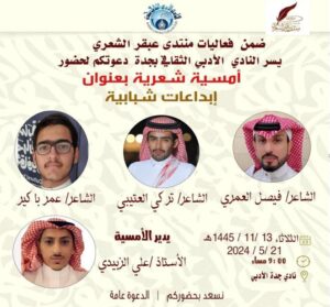 تأتي هذه الأمسية ضمن فعاليات منتدى عبقر الشعري الثقافية والإبداعية بالنادي الأدبي الذي يسهم في إثراء المشهد الشعري والثقافي محليًّا وعربيًّا.