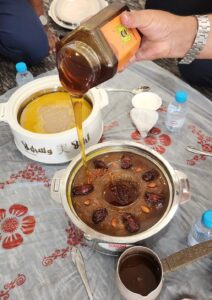 ذهبتُ بكم بعيدًا، وأنتم مَنْ تَنشدونَ قِصصَ الرحلة، وكالعادة دعانا مُضيفنا -بعد شربِ القهوةِ السعودية- إلى ما يُسمونهُ أهلُ الجنوب “اللَّطَفْ”، وهي ك”التَصبِيرَةِ” عند أهل الحجاز، وسُمَّيتْ كذلك لأنها تُلطِّف الجُوعَ أي تُخفِّفهُ، حتى يحينُ موعدُ الوجبةِ الرئيسة، فكانت تلك “العريكة” و”المشغوثة” أمامنا، وقد اختلفتا على ما أكرمنا به في الزيارة الماضية، إذ قامت -وقتذاك- ابنتا مُضيفِنا الغاليتان “إيمان ووجدان” مع والدتهما أم عبدالله، أختنا الداعية “عائشة آل جروان” بإعدادِ ألذِّ ما ذُقتُ في كُلِّ حياتي من “المشغوثة” و”المبثوثة” و”العريكة” و”العصيدة”، بما بقيَ طعمُها الأروعُ -ورفقتي- في أفواهنا ليومنا هذا، وقد أعدَدنهُ بطريقةٍ مُذهلة، تذوبُ في الفم ذوبًا، وبنكهة سحريَّةٍ خالصَةٍ، إذْ كانت مُدَخَنَة، بما تصنعُ الأمَّهاتُ الأوائلُ في الحجاز طبقَ الفولِ في شهرِ رمضانَ بالجَمْرِ، الذي يُعطي الفولَ نكهةً وأيَّة نكهة!