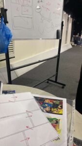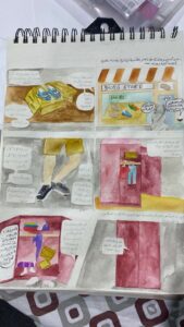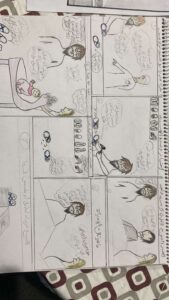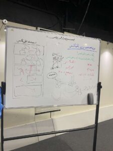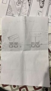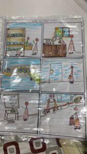 ثم أعطت المدربة مثالًا واقعيًّا للوحة القصة التي كانت من عمل المدربة، حولت فيها قصة قصيرة من تأليف الدكتورة حصة الحارثي إلى كومكس شرحت فيها خطوات العمل عليها حسب ما رأته المدربة من خلال السيناريو المعطى.