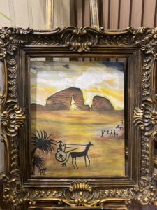 تجسد اللوحة، التي تحمل عنوان “جبل الفيل والرسوم الحجرية”، أحد أهم المعالم الأثرية في العلا، حيث تبرز تفاصيل الحياة القديمة من خلال رسومات مستوحاة من النقوش الصخرية التي تعود لآلاف السنين. بأسلوب فني يمزج بين الأصالة والحداثة، استخدمت الفنانة ألواناً ترابية دافئة تعكس روح الصحراء، وأدخلت عناصر مستوحاة من الرسوم الحجرية التي توثق أنماط حياة الإنسان القديم، بما في ذلك وسائط النقل التقليدية والممارسات اليومية. الإطار الفخم يضفي على العمل لمسة تراثية تتناسب مع القيمة التاريخية للموضوع. تُعد هذه اللوحة جزءًا من سلسلة أعمال فنية تهدف إلى إحياء التراث العربي والتعريف؟ بحضارات المملكة العريقة. وتدعو الفنانة عشاق الفن والتراث إلى استكشاف أعمالها التي تحمل رسالة ثقافية وفنية غنية. ليوم التأسيس في المملكة العربية السعودية