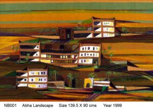 كبرت وباتت تتنقل من مكان إلى آخر وما زالت تلك الأقمشة الملونة تحملها في ذاكرتها، وتنتعش بجمالها وحيويتها، وحينما عادت لأرض الوطن افتتنت بطبيعتها ومبانيها التراثية وحدائقها، فبدأت قصتها مع اللوحة بشغف الألوان، بدأت تطرز المباني بحس تجريدي، وهي التي شاهدت أعمال كبار الفنانين في العالم في طفولتها وشبابها، حينما تنقلت من الهند إلى لبنان وإلى الولايات المتحدة الأمريكية، وبهذا أصبحت تعي جيدًا أصول الفن وأسراره، حيث إن (أحد الدوافع الأساسية في الفنون جميعًا هو التعبير عن النفس)، والفنانة نبيلة البسام كانت زاهدة في اللون تعبيرًا عن شغفها وحبها للمكان، بتجريدية وابتكار يحسب لها في ذلك الوقت مع بدايات الستينيات الميلادية في توظيفها للأقمشة الملونة والفضيات التي لها قيمة تراثية في مفهوم الرمزية المكانية، وهي ترتبط بتراث المملكة بكل تفاصيله المعمارية، خصوصًا العمارة في جنوب المملكة الملونة والمزخرفة.