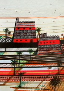 في مثل هذا المسار الفني يتوجب علينا البحث في هذه التجربة وتلك، عن أسباب التجريب التشكيلي في صيغه المختلفة، وتجربة الفنانة نبيلة ثرية وغنية بما يحرضنا على البحث في أسباب العلاقة بين المادي والفكري والجمالي في صياغة العمل التشكيلي، ولعلي هنا أعول على الفترة الأولى من حياتها في الهند، التي القت بظلالك على المفهوم الفلسفي للفن، والتأمل هو جزء من الحياة العامة في الهند، لذا لم يكن الفن لديها ممكنًا دون تجريب في عدد من الخامات، وباستخدام الأقمشة الملونة، وتطريزها بالفضيات كان فضاءً خصبًا للإبداع، فاستطاعت أن توجد لنفسها مساحة للتعبير عن ذاتها وشخصيتها الساكنة الهادئة، التي استطاعت عبر سنين أن تترجم حبها للعمارة من خلال هذا الأسلوب التجريدي التي تنتمي إليه حتى تجعل من معالجة الموضوعات ذات طابع خاص بها دون غيرها.
