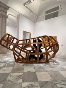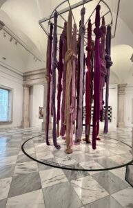 عرضت الفنانة فيكونيا فكرتها عبر تمثيل تاريخي رمزي عريق لحضارة وثقافة أمة الأنكا التي تنتمي جذورها إلى حضارات الأنديز شرقي أمريكا الجنوبية، حيث بلغت ذروتها عندما تميّزت باعتمادها على أنظمة معرفة لا تقوم على الكتابة الأبجدية، بل على الطريقة التي تجمع بين الممارسة، والذاكرة الجماعية، والعلاقة الروحية مع الطبيعة. في هذا التقاطع الفريد لم تكن المعرفة التي قدّمها العمل منفصلة عن الجسد الذي يلتف حولها، بل تجربة متجسدة فيه، تُنقل عبر اللمس، والحركة، والاستبصار، فجاء العمل المعروض كمادة ضخمة عملاقة مكونة من حبال صوفية ملونة ذات عقد بأشكال تحمل الكثير من الرموز والدلالات، إنه تنظيم لوني وفضاء شكلي جعلني كمشاهد فضولي يبحث دومًا عن المعنى، شريكة في إنتاج معاني لهذا العمل المفاهيمي مستعينة بأدوات البحث عن الفنانة، وبيان العمل الذي تم عرضه أول مرة في عام 2017، واقتنائه في عام 2023 ضمن مبادرة التاريخ النسائي الأمريكي في متحف سميثسونيان، والاعتراف به، ليس فقط كعمل فني، بل كجزء من كتابة تاريخ بديلة من أصوات نسائية وأصلية، وأعيد عرضه ومشاهدته في نسخة 2025 في متحف سميثسونيان للفن الأميركي في واشنطن.