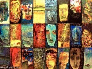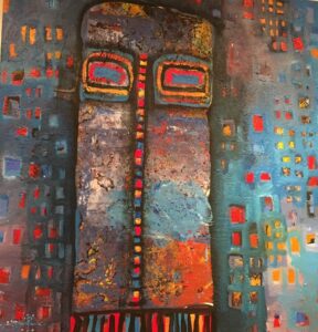 الأحمر عنده نبض وجودي، والأزرق فضاء ميتافيزيقي، والأصفر إشراقة ذهنية، هذه الألوان لا تتصالح بل تتجاور وتتناغم بنِدية، لتخلق صدمة بصرية تحرر الرمز التقليدي من قيود الماضي وتلقي به في أتون المعاصرة.